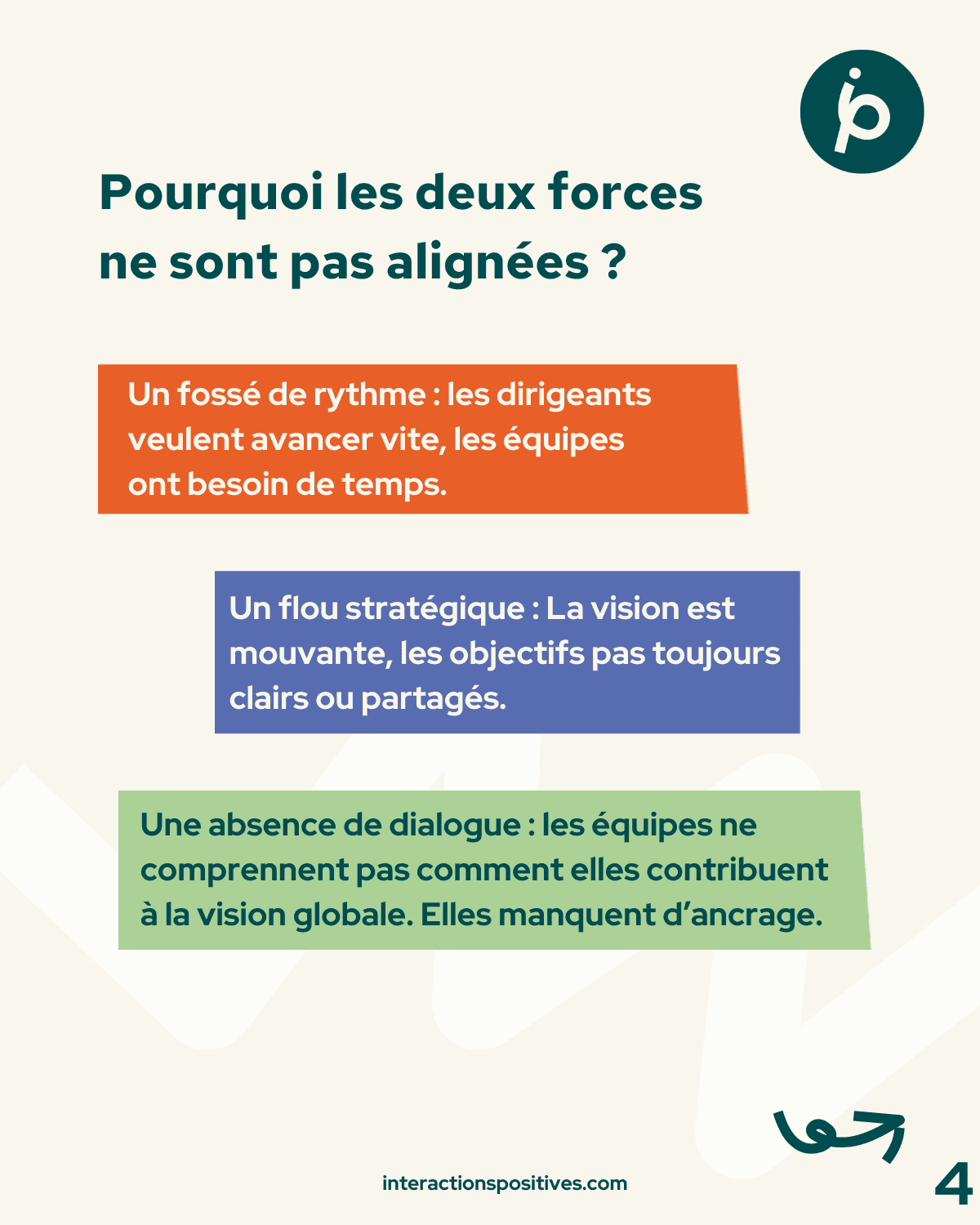 - Un fossé de rythme : Les dirigeants souhaitent avancer vite, tandis que les équipes ont besoin de temps pour s’approprier les changements.
