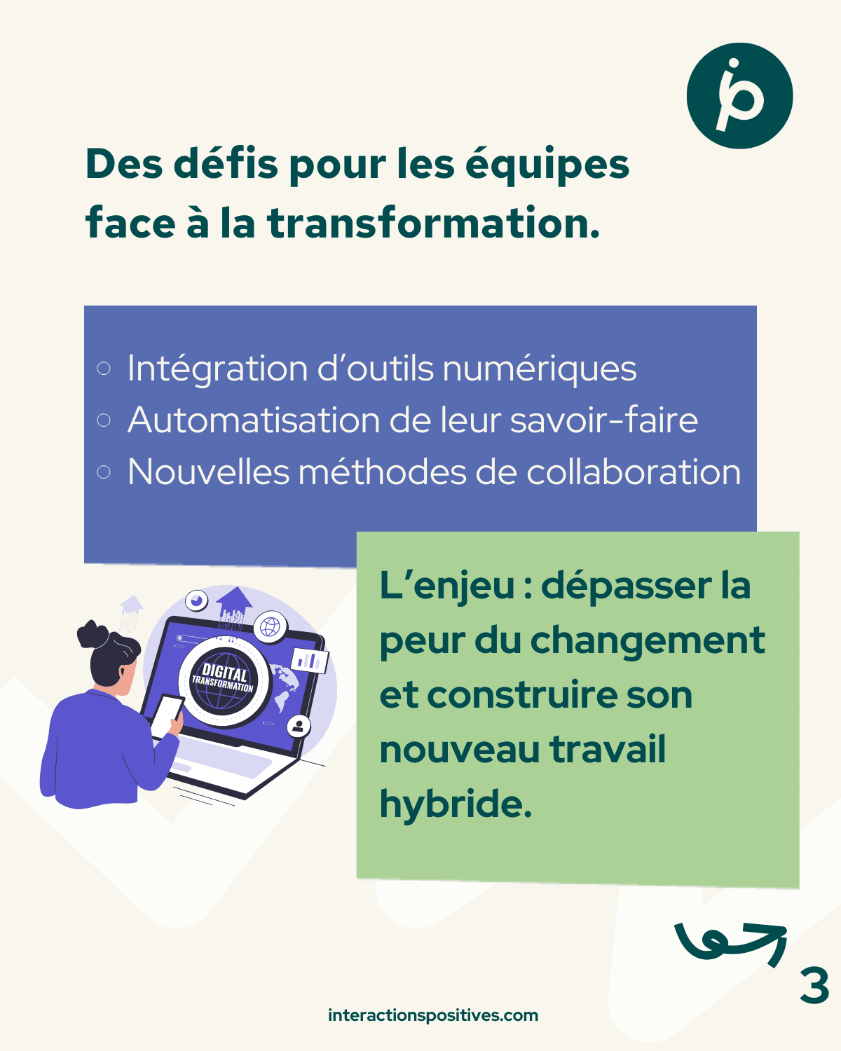 Pour les équipes, les défis sont tout aussi importants. Elles doivent intégrer des outils numériques, automatiser leur savoir-faire et adopter de nouvelles méthodes de collaboration. Cependant, cette transformation peut générer des résistances, notamment la peur du changement. Construire un cadre de travail hybride qui favorise la confiance et l’efficacité devient alors essentiel.